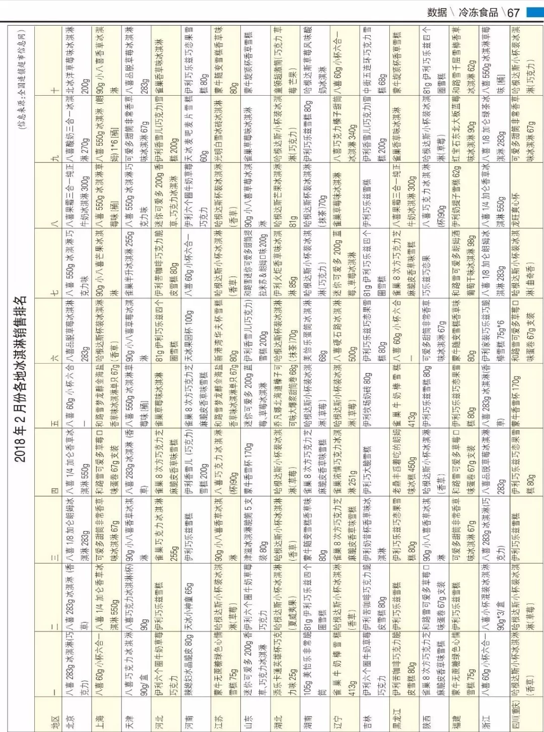 ▼2018年2月份各地冰淇淋銷售排名