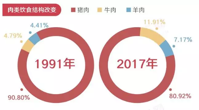從上圖可以看出,在豬肉消費下降的同時,牛羊肉的消費正在崛起。尤其是牛肉方面,從4.79%增至11.91%,占據(jù)了豬肉消費分流的絕大部分。