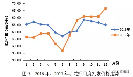 小龍蝦上市供應期較為集中,季節性分化明顯,市場價格受上市供給量影響較大。據全國水產品批發市場信息系統監測,2016-2017年,小龍蝦批發價格峰值都出現在春冬上市淡季,價格谷值都出現在夏秋上市旺季。
