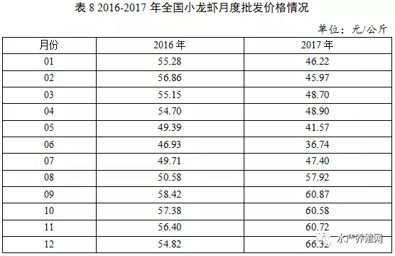 據對全國水產品批發市場價格監測數據分析,2017年3-4月份小龍蝦批發市場價格較高,一般為45-55元/公斤,5月下旬至6月底價格短期回落,低位運行在35-45元/公斤,7月上旬開始回升并一路走高,達60-70元/公斤。
