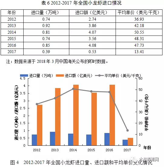 2017年,由于沒有對未凍小龍蝦進行進口,小龍蝦進口量僅為0.39萬噸、進口額0.53億美元,較2016年分別下降了54.12%、87.01%。