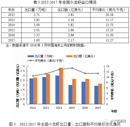 一直以來,中國小龍蝦出口市場主要集中在美國和歐洲,占出口市場比重的80%以上。2017年,受歐盟對中國小龍蝦產品進口關稅調整、美國對中國小龍蝦仁反傾銷調查以及國內原料蝦價格上漲等因素影響,大部分小龍蝦加工企業將精力轉為增長較快的國內消費市場,小龍蝦出口量1.93萬噸、出口額2.17億美元,較2016年分別下降了17.87%和18.42%。