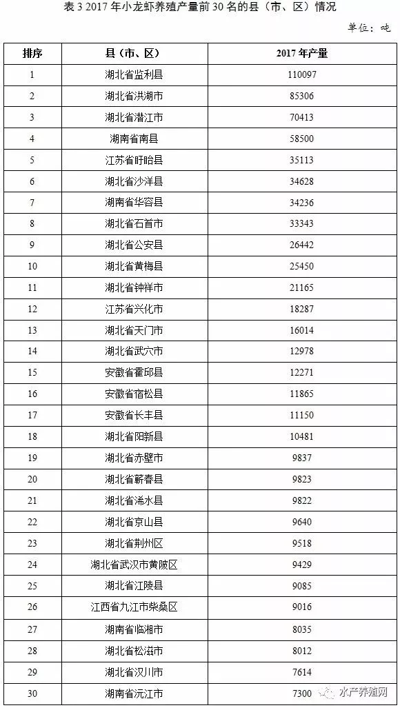2017年,全國小龍蝦養殖產量前30名的縣(市、區)中,湖北省20個、湖南省4個、安徽省3個、江蘇省2個、江西省1個。30個縣(市、區)的小龍蝦養殖總產量為73.49萬噸,占全國小龍蝦養殖總產量的65.05%。其中,湖北省監利縣小龍蝦產量為11萬噸,是唯一產量超過10萬噸的縣。