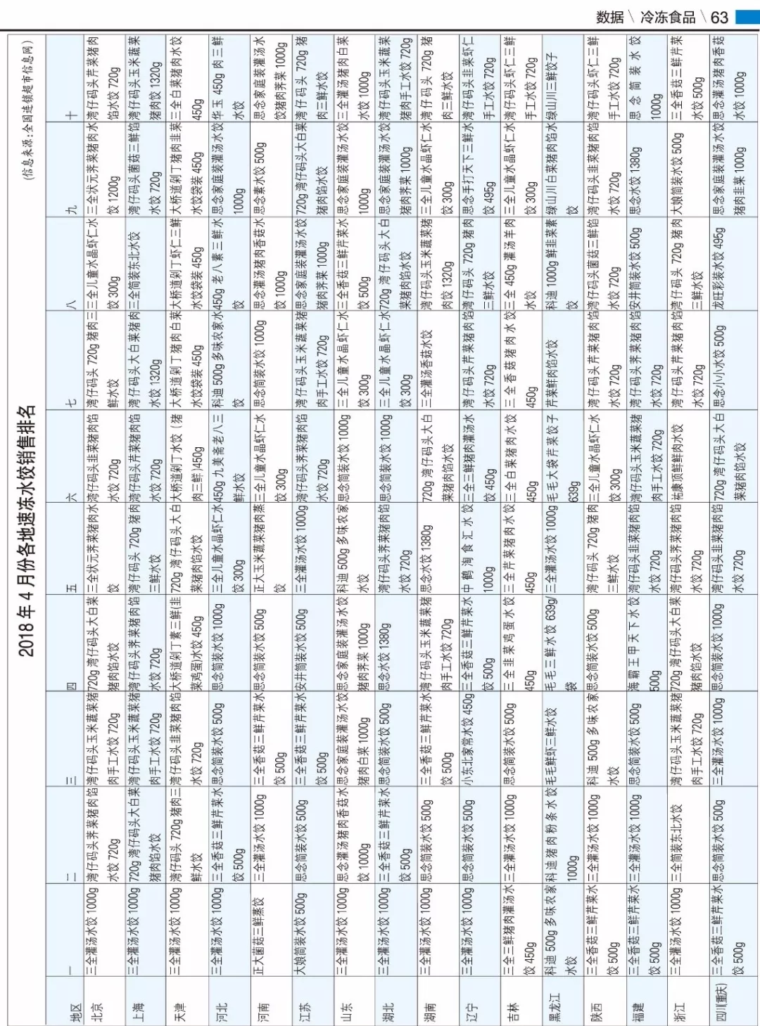 數據丨2018年4月份各地速凍水餃銷售排名