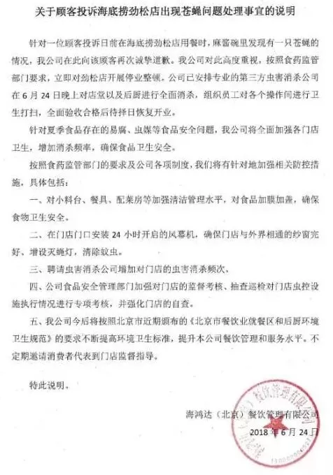 經歷“老鼠門”事件不足一年的海底撈北京勁松店近期再曝食安隱患。6月24日夜間,海底撈針對此前一則蘸料存在蒼蠅的有關投訴發布聲明,稱按照市食藥監管理部門要求,立即對勁松店開展停業整頓。并安排第三方蟲害消殺公司在6月24日晚上對店堂以及后廚進行消殺作業,待驗收合格后擇日恢復營業。