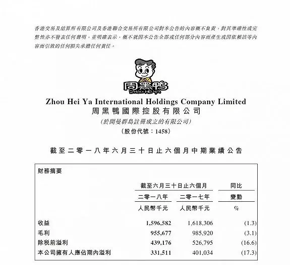 來源: 冷凍食品網 發布者:編輯日前,周黑鴨(01458.HK)在港發布了截止2018年6月30日止6個月中期業績公告,實現收益約為15.97億元,和去年同期約為16.18億元相比,下降1.3%;本公司擁有人應占期內溢利接近3.32億元,相較于2017年上半年4.01億元,降幅在17%以上。