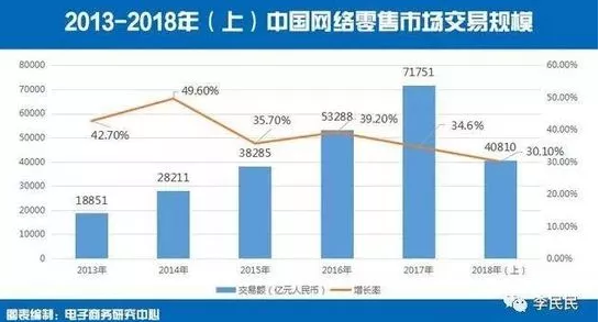 中國電子商務研究中心發布的《2018年(上)中國網絡零售市場數據監測報告》(以下稱之為“報告”)顯示:2018年上半年國內網絡零售市場交易規模達40810億元,同比增長30.1%。