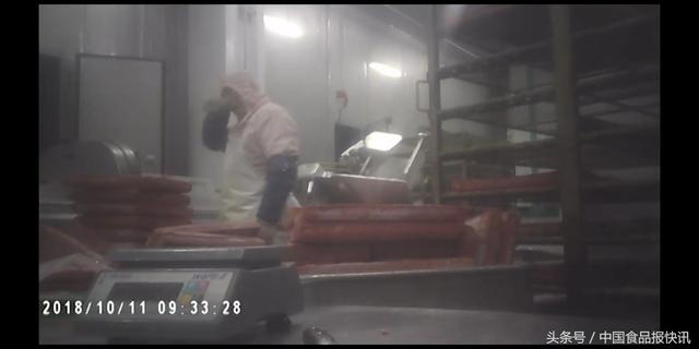 包裝車間內(nèi),一個近兩米高、銹跡斑斑的鐵架上,碼放著沒有切片的肉制品。一個身著多處污漬工裝、手戴已經(jīng)變色的白色線制手套、沒有戴口罩、50多歲模樣的工人,陸續(xù)將大塊兒肉制品搬運到切片機上。這名工人時不時戴著污漬手套觸摸銹跡斑斑的鐵架,時不時會摳揉鼻子,然后再去搬運鐵架上的肉制品。