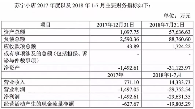 從其公告中披露出的最新業(yè)績來看,該筆增資對蘇寧小店十分重要。數(shù)據(jù)顯示,蘇寧小店2018年1至7月營收1.43億元,虧損2.96億元,債務高達6.53億元。股權(quán)轉(zhuǎn)讓的前提,即蘇寧易購清理掉此債務。此次將蘇寧小店業(yè)務剝離出上市公司,也是防止未來蘇寧小店擴張造成的虧損影響到上市公司的業(yè)績。
