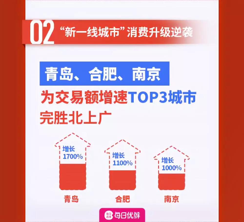 數據報告稱,以青島為代表的“新一線城市”生鮮消費實力驚人。與去年同期相比,青島、合肥、南京交易額同比增速位列全國前三,實現消費升級逆襲,超過北上廣。