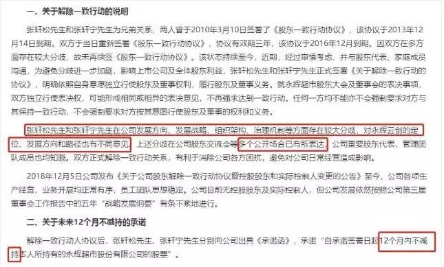 公告表示,張軒松和張軒寧在公司發(fā)展方向、發(fā)展戰(zhàn)略、組織架構(gòu)、治理機(jī)制等方面存在較大分歧,對永輝云創(chuàng)(超級物種)的定位、發(fā)展方向和路徑也有不同意見。為避免分歧進(jìn)一步加劇,影響上市公司及全體股東利益,張軒松先生和張軒寧先生正式簽署《關(guān)于解除一致行動的協(xié)議》。