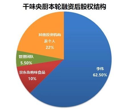 本次融資完成后,千味央廚實際控制人李偉持股62.5%,京東和絕味食品合計持股10%,管理團隊占比5.5%,其他投資機構和個人占比22%。