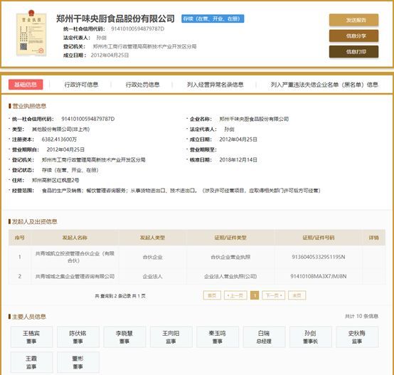 工商登記信息顯示,鄭州千味央廚食品股份有限公司于2012年4月25日注冊成立,注冊資本6382萬元,由共青城凱立投資管理合伙企業(有限合伙)和共青城城之集企業管理咨詢有限公司共同出資。