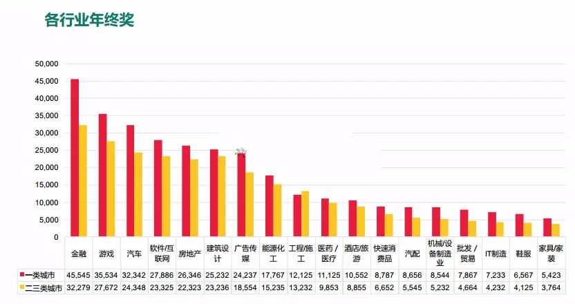 根據(jù)2016-2017年年終獎(jiǎng)?wù){(diào)研報(bào)告顯示,近半數(shù)企業(yè)人均年終獎(jiǎng)在5001—10000元的額度,19%的企業(yè)人均年終獎(jiǎng)少于5000元,超17%的企業(yè)人均年終獎(jiǎng)10001-30000元,當(dāng)然同樣有15%的任性企業(yè)人均年終獎(jiǎng)?lì)~度超過(guò)3萬(wàn)元。按行業(yè)分類,金融、游戲、汽車行業(yè)年終獎(jiǎng)?lì)~度最高,鞋服、家具家裝行業(yè)年終獎(jiǎng)?lì)~度最少。
