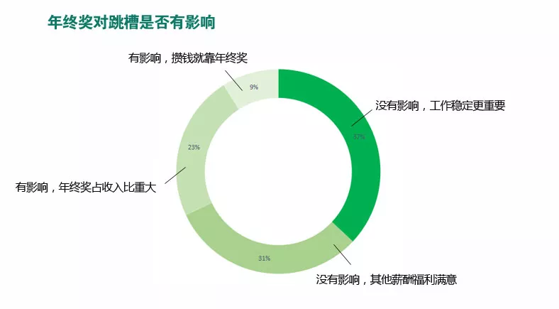 但是即便大部分人對(duì)今年的年終獎(jiǎng)的增長(zhǎng)沒(méi)有信心,卻很難讓他們因?yàn)槟杲K獎(jiǎng)而跳槽。半數(shù)以上的受訪者年終獎(jiǎng)?wù)既晔杖氲谋壤齼H為20%左右,即便不滿意年終獎(jiǎng),但工作的穩(wěn)定性、工作環(huán)境、企業(yè)福利是他們更看重的要素。只有少數(shù)受訪者表示收入依賴年終獎(jiǎng),如果年終獎(jiǎng)不滿意一定會(huì)尋找機(jī)會(huì)跳槽。因此企業(yè)在人才管理上,需要特別注意年終獎(jiǎng)對(duì)于員工保留的影響,提前做好預(yù)防工作。