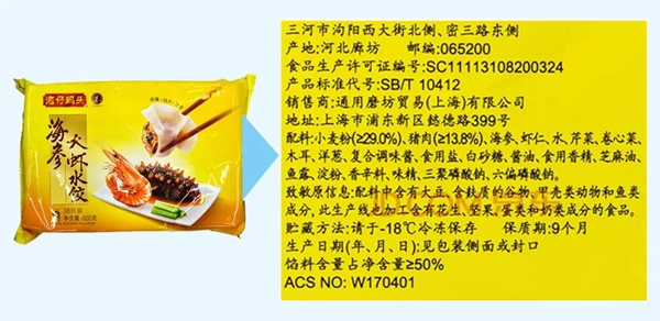 “食品名稱中提及的某種配料或成分而未在標簽上特別強調,不需要標示該種配料或成分的添加量或在成品中的含量。”該工作人員說,海參大蝦水餃只是食品名稱,其圖案及文字不是標和蝦仁的含量。而且海參大蝦并不是特別強調,只是表述產品真實屬性的名簽中強調的內容,因此可以不用標注海參稱。