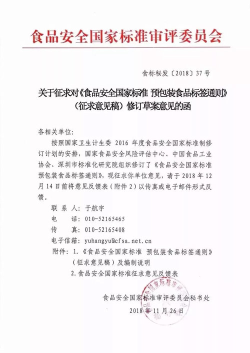 2018年底,食品安全國家標準審評委員會對外發布的關于征求對《食品安全國家標準 預包裝食品標簽通則》(征求意見稿)修訂草案意見的函。