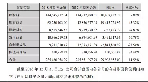 1、截至2018年12月31日止,公司合并報表存貨項目同比增加29,908,957.00元,同比增長14.55%,具體數據如下表: