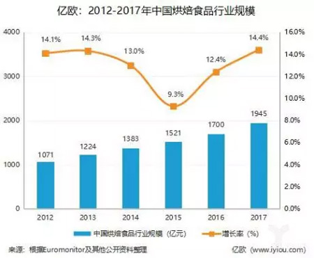 有大數據為證。2012—2017年,五年間,我國烘焙產品的銷售額已由1071.02億元增長到1944.79億元。
