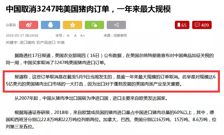 近日很多媒體發(fā)消息稱,“中國(guó)取消3247噸美國(guó)豬肉進(jìn)口訂單,總價(jià)值65億美元。”經(jīng)冷食君查證發(fā)現(xiàn),65億美元并非此次取消訂單的總價(jià)值,而是指美國(guó)豬肉出口市場(chǎng)總規(guī)模達(dá)65億美元。