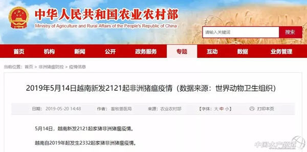 據世界動物衛生組織消息,5月14日,越南新發2121起家豬非洲豬瘟疫情。越南自2019年起發生2332起家豬非洲豬瘟疫情。