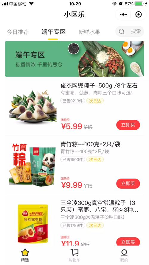 小區(qū)樂在小程序中專門設(shè)置了“端午專區(qū)”,一款500克的俊杰網(wǎng)兜粽,截至6月5日上午10:29,已售出9213件。