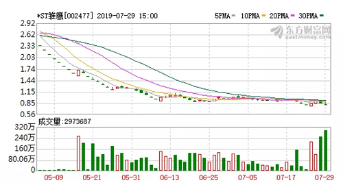 截至昨日收盤,*ST雛鷹收跌4.71%,股價0.81元,已連續17個交易日位于1元面值下方,退市已成定局,即使股價之后三個交易日連續漲停亦無法突破1元。