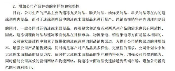 這點可以看看惠發(fā)食品的2018年年報。年報中說,經(jīng)銷商在銷售速凍調(diào)理肉制品的同時,一般會同時經(jīng)銷速凍米面制品。為滿足客戶對產(chǎn)品品類多樣性、完整性的需求,公司計劃未來加大速凍米面制品的研發(fā)力度,適時擴大速凍米面制品的生產(chǎn)和銷售業(yè)務(wù)。