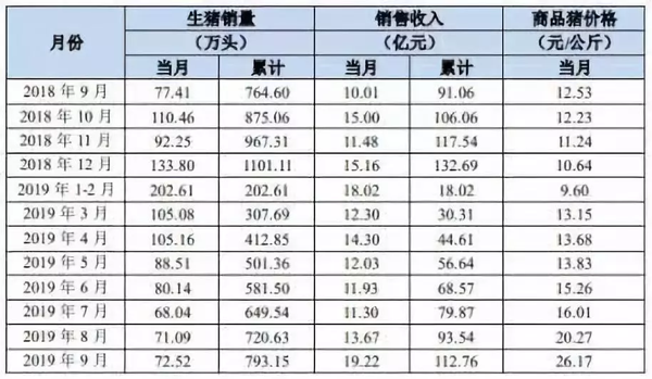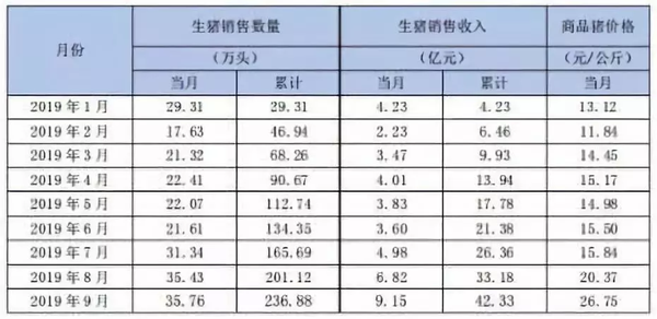 2019年1~9月銷售商品豬202.7萬頭,銷售收入33.27億元,銷售均價15.39元/公斤,同比變動分別為40.91%、69.59%、28.34%。