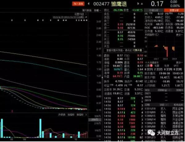 在退市整理初期,雛鷹農牧股價持續跌停,直至0.2元/股才企穩。此后,雛鷹農牧股價便在0.2元/股上下小幅波動,最終定格在了0.17元/股。截至收盤,雛鷹農牧最終總市值5.33億元,較2015年股價最高時的市值縮水98%。