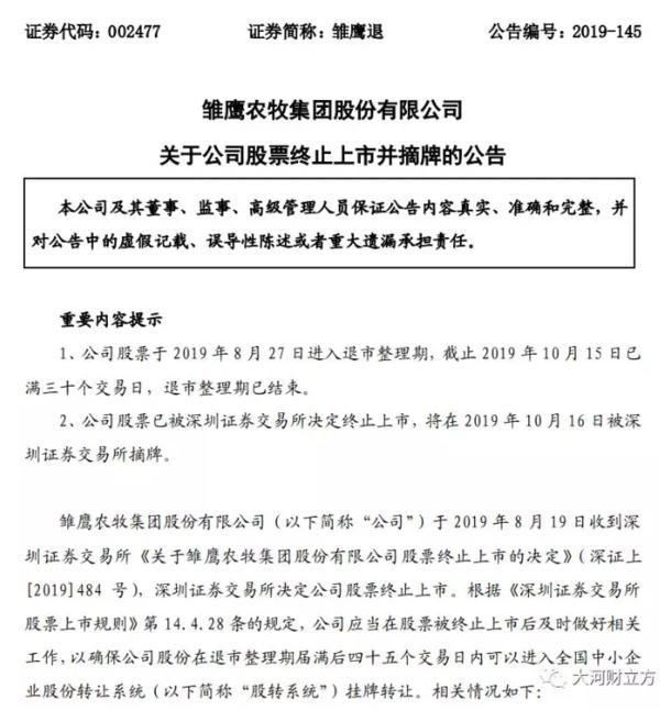 剛剛!雛鷹農牧集團股份有限公司(以下簡稱雛鷹農牧)發布公告,宣告其股票已被深交所決定終止上市,將在2019年10月16日被深交所摘牌。