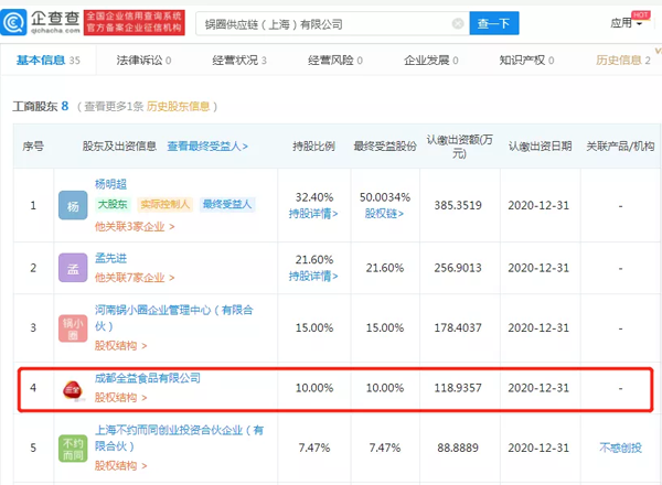 冷食君在企查查上查詢到,鍋圈供應(yīng)鏈(上海)有限公司成立于2019年07月11日,部分股權(quán)結(jié)構(gòu)如下,其中的成都全益食品有限公司即為三全食品的子公司。