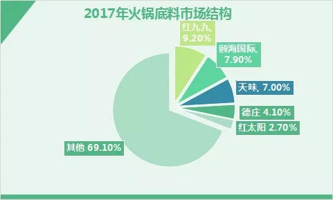 2017年,中國(guó)調(diào)料的市場(chǎng)規(guī)模大致在4100億元,其中復(fù)合調(diào)料約為980億,占行業(yè)的24%左右。而在復(fù)合調(diào)料中,火鍋大概占1/4,規(guī)模約為200億。
