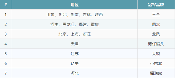 同之前獨攬8、9個第一相比,三全本月的業績略有下降,僅在5省獲得第一;思念食品緊隨其后,在4個省獲得第一,業績進步明顯;龍鳳水餃后勢勁兒足,一舉拿下3省之冠;往月在北京、上海表現突出的灣仔碼頭,11月僅在天津一地奪冠;有趣的是,河北地區冒出個新冠軍——“福潤家順福東北風味水餃”。