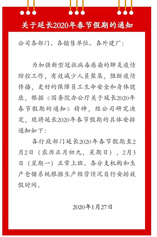 昨日,思念食品通過鄭州思念微信公眾號發出通知,表示,將延長2020年春節假期至2月2日。