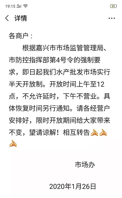 河南中原四季水產物流港也在昨天發布緊急通知,延期開市。