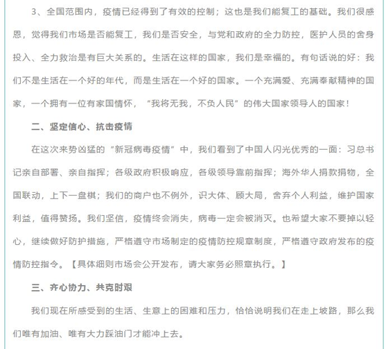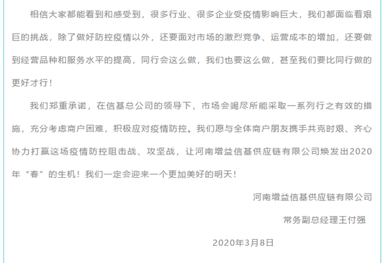 3月8日下午,河南增益信基供應鏈有限公司官微發布《致商戶朋友的一封公開信》。文中表示,在信基總公司的領導下,市場將分批開門營業: