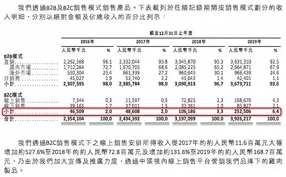 招股書(shū)稱,B2C業(yè)務(wù)的加入能夠減輕與大型商業(yè)客戶議價(jià)能力的劣勢(shì),并有助于提高雞肉生產(chǎn)商的利潤(rùn)。深加工雞肉制品的主要銷售和分銷渠道包括在線電子商務(wù)平臺(tái)和線下渠道,如超市、便利店以及特產(chǎn)店。