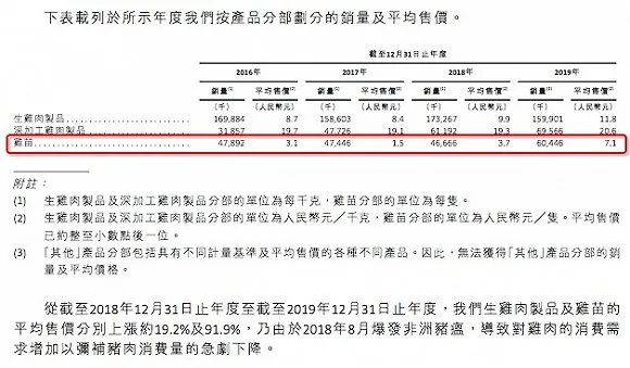 從鳳祥食品給出的主要三類產(chǎn)品價(jià)格趨勢(shì)看,每只雞苗的價(jià)格自2016年至2019年分別為3.1元、1.5元、3.7元、7.1元 ,雞苗價(jià)格在2019年翻了一番。