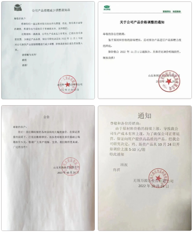 其中興威食品從10月30日到11月2日,三天內就發布了兩份調價通知。