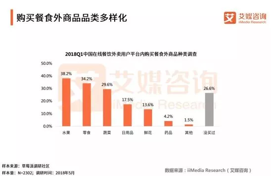 數據顯示,只有26.6%的受訪在線外賣用戶沒有在在線餐飲外賣平臺購買過餐食外商品,大部分用戶均在平臺內購買過餐食外商品。其中,以水果、零食、蔬菜等與平臺業務相關性較高的食品購買比例靠前,而鮮花、藥品、日用品等商品的購買率較低。