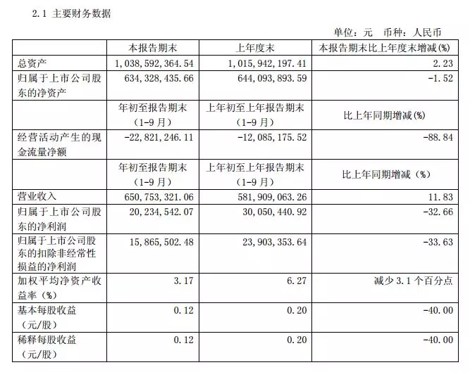 公告顯示,公司前三季度實現營業收入 6.51億元,較上年度同期5.82億增長11.83%;實現凈利潤2,023萬元,較上年度同期3,005萬元下降 32.66%。
