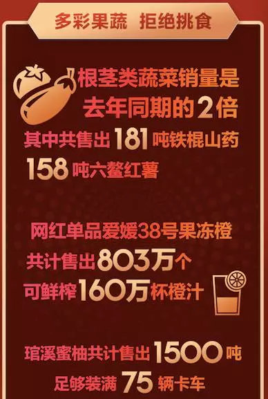 在果蔬單品銷售榜中,VC滿滿的網(wǎng)紅單品愛媛38果凍橙占據(jù)了C位,共計(jì)賣出803萬個(gè),可鮮榨160萬杯500ml的橙汁;同樣富含VC的知名“網(wǎng)紅”琯溪蜜柚共計(jì)售出1500噸,足夠裝滿75輛卡車;代表著健康的根莖類蔬菜同樣銷量不俗,181噸鐵棍山藥,158噸六鰲紅薯被搶購一空。