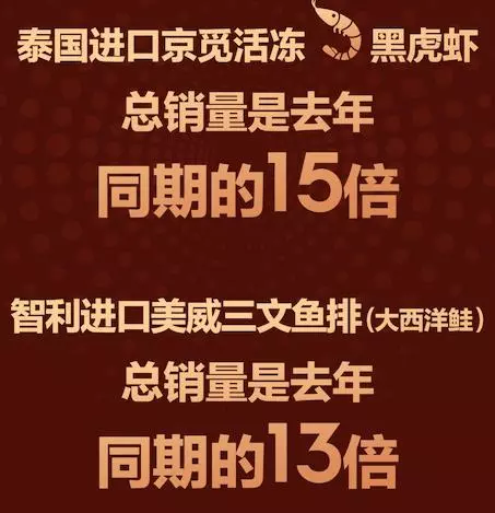 其中,泰國海產(chǎn)總銷量是去年同期6倍;智利共計(jì)售出56噸海鮮水產(chǎn),是去年同期的5倍;挪威海產(chǎn)銷量達(dá)30000件,其中僅三文魚便占到了總銷量的30%;加拿大大龍蝦共計(jì)賣出12噸,頭尾相連可繞天安門廣場三圈;自營法國生蠔銷量是去年同期的15倍……