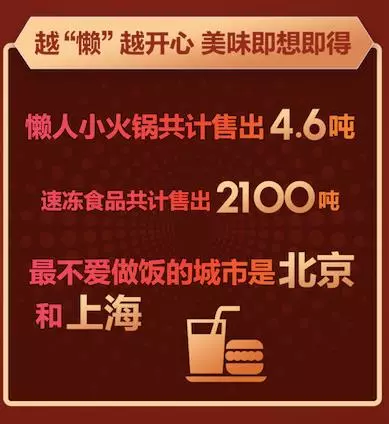 數(shù)據(jù)也證明了“懶人經(jīng)濟(jì)”的真實(shí)存在。11.11期間,京東生鮮懶人小火鍋(自熱火鍋)共計(jì)賣出4.6噸;速凍食品共計(jì)售出2100噸;方便菜銷量是去年同期的1.8倍;火鍋相關(guān)食材售出757噸,夠冰島全民一起吃五次火鍋,其中北京地區(qū)消費(fèi)者買得最多;簡單加工就能食用的面點(diǎn)銷量是去年同期的2倍;速凍水餃、餛飩的銷量也接近去年同期的2倍。
