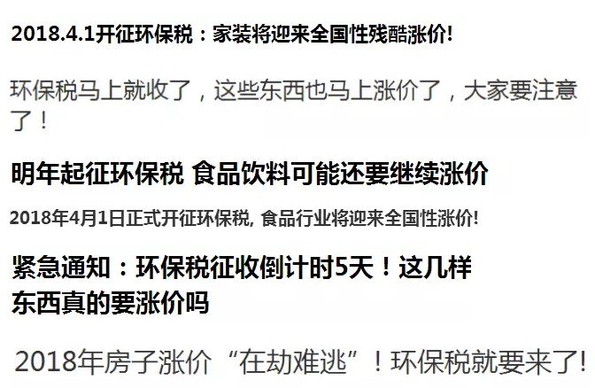這種近乎“煽動性”的文章比比皆是。隨手在網(wǎng)絡上搜索關(guān)鍵字“環(huán)保稅”、“漲價”等,各行各業(yè)都難于幸免。滿眼“漲價潮”弄得人心慌慌。